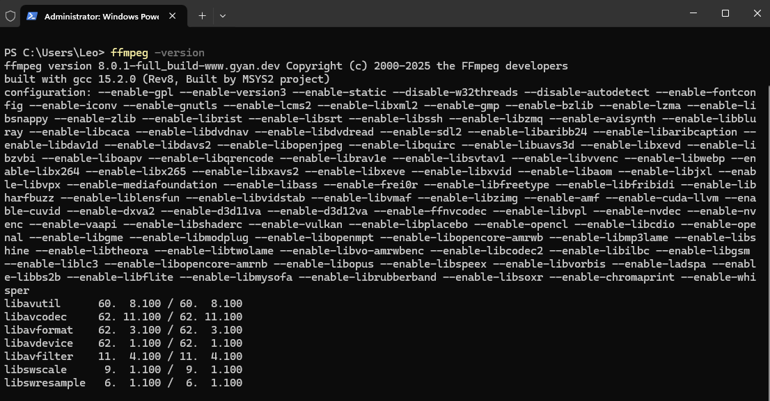 Um zu testen, ob die Installation erfolgreich war, kannst du in ein Terminal (z.B. PowerShell) den Befehl "ffmpeg -version" eingeben.